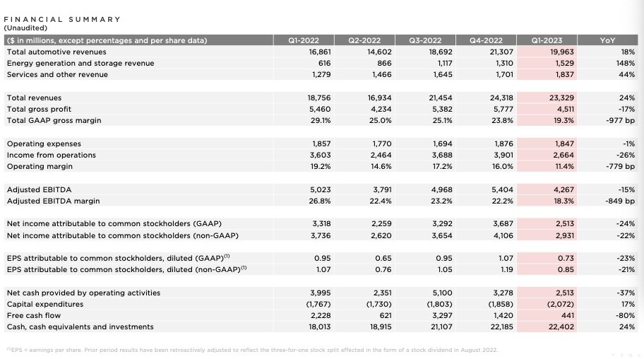 财务数据方面,其一季度总收入为233.3亿美元,同比增长24%,但因销售成本没有和售价同步下降,导致特斯拉一季度毛利率也应声下跌,至19.3%,几乎是近两年来最低的水平。