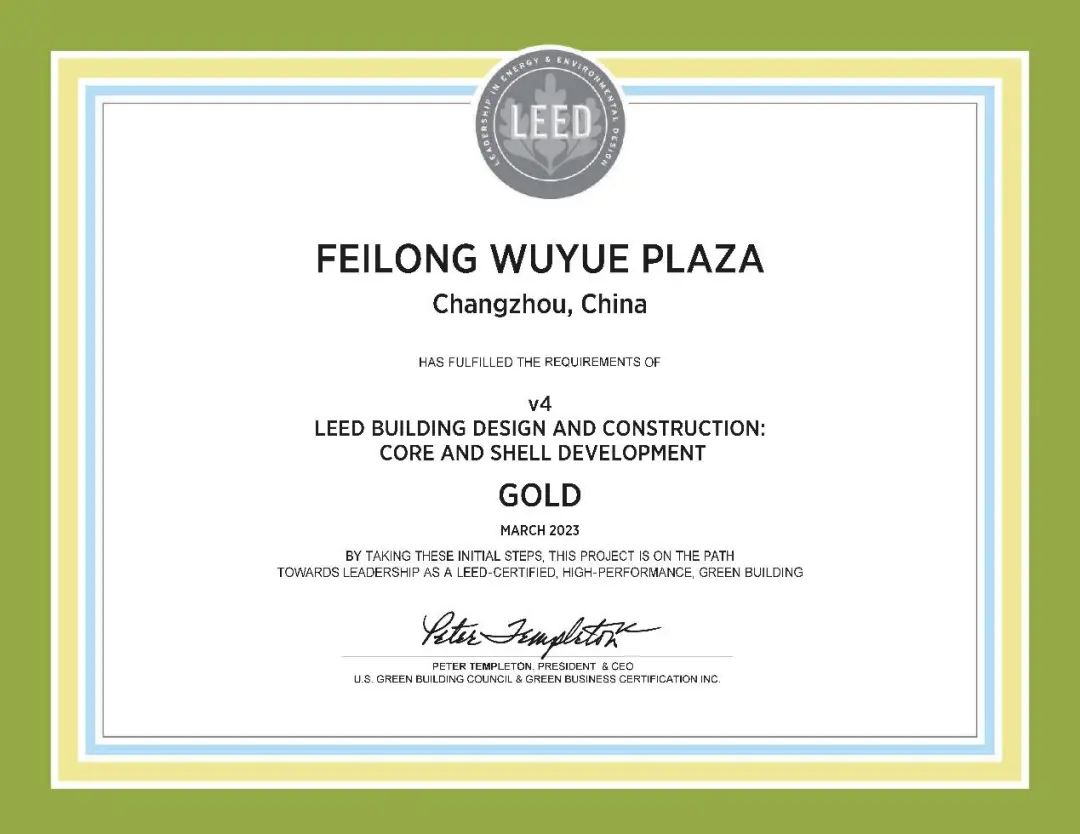 常州飞龙吾悦广场LEED金级预认证证书