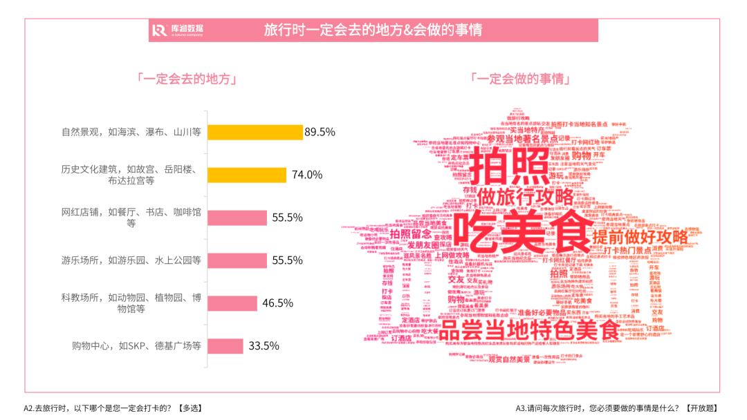 90后在旅行前会做好旅行攻略,在旅行时则开心吃美食、拍照片、打卡景点。部分人还会购物、买纪念品,极小部分人会购买意外险、去旅行地的动物园、旅行时交朋友。