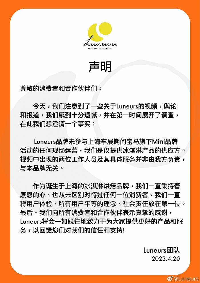 而事件所涉冰淇淋品牌@Luneurs 也在当日下午发布道歉声明称:未参与上海车展期间宝马旗下MINI品牌活动的任何现场运营,我们是仅提供冰淇淋产品的供应方。视频中出现的两位工作人员及其具体服务并非由我方负责,与本品牌无关。