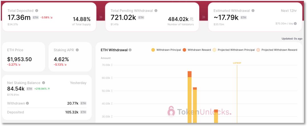 据Token Unlock实时数据,从上海升级完成到4月20日下午4点的一周时间里,一共有133万ETH申请提出,而在这期间还有65.56万 ETH存入,净流出数量约为67.44万枚。