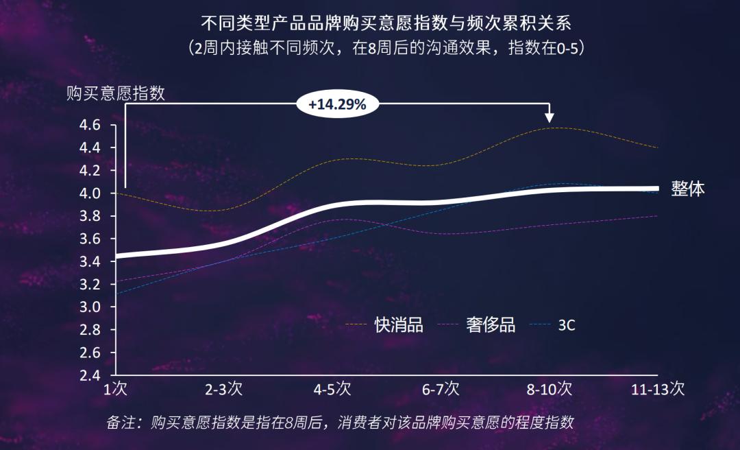 群邑智库OTT调研数据显示,大屏能够通过主流资源的反复投放,提升消费者兴趣,形成消费决策;2周内8次以上的投放可以形成显著的购买意愿提升,快消等短链路产品提升更为明显,中长链路则依赖更长效的曝光。