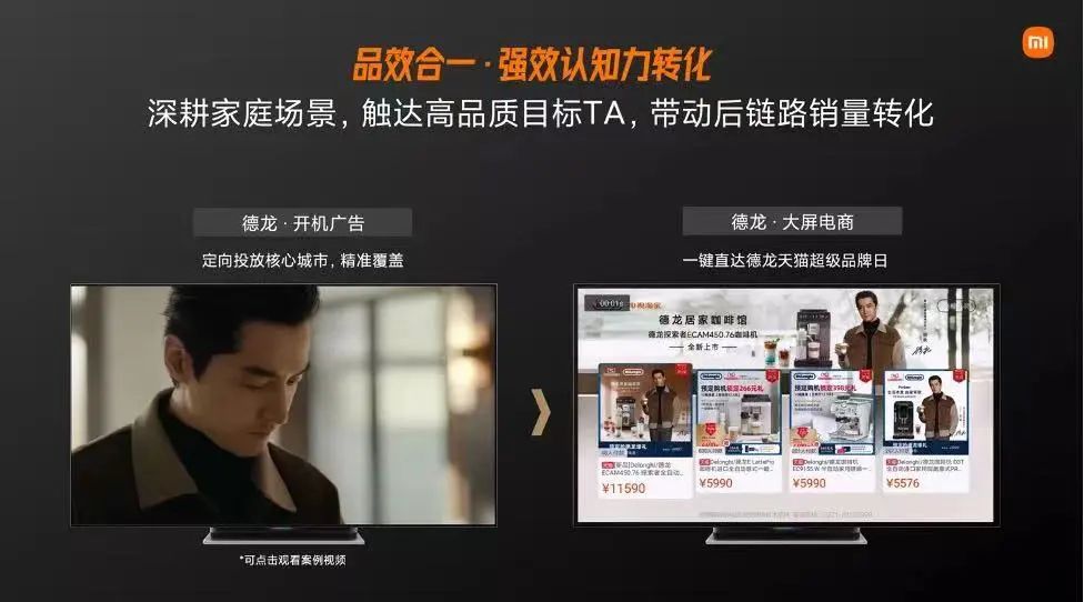 比如德龙新品与小米OTT合作中,以数据为支撑,精准锁定京沪地区高品质家庭用户,通过OTT开机视频将居家咖啡馆意趣一一展现在用户面前,将用户带入完整的消费生活场景,创造与用户共情时刻,成功激发购买欲,兴趣用户可一键直达大屏电商直接进行购买,最终达到以强兴趣激发驱动预购,触动后链路转化。