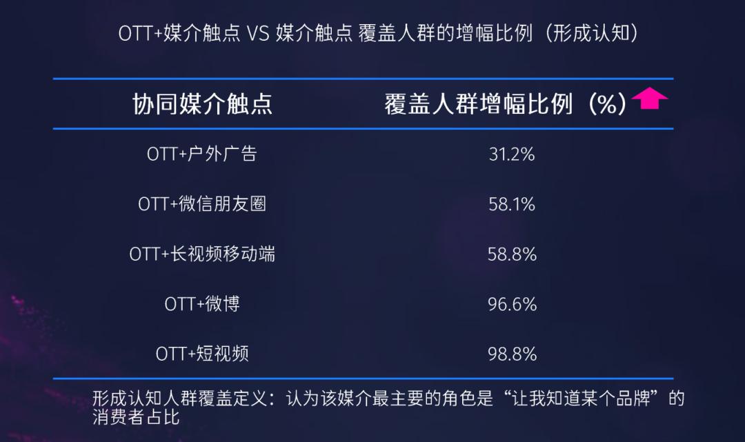 从“品”来看,OTT协同其他媒介的多渠道全域覆盖,对品牌认知度提升有较大影响,且差异化明显。凯度数据研究显示,OTT与协同媒介触点的覆盖人群增幅比例,从户外广告到短视频,呈现递增的趋势。