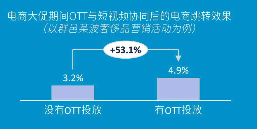 同时,OTT在自身的转化链路之外,也能与其他媒体投放形成协同效果。群邑投放数据显示,有OTT投放与短视频协同之后,电商的跳转效果提升了53.1%。