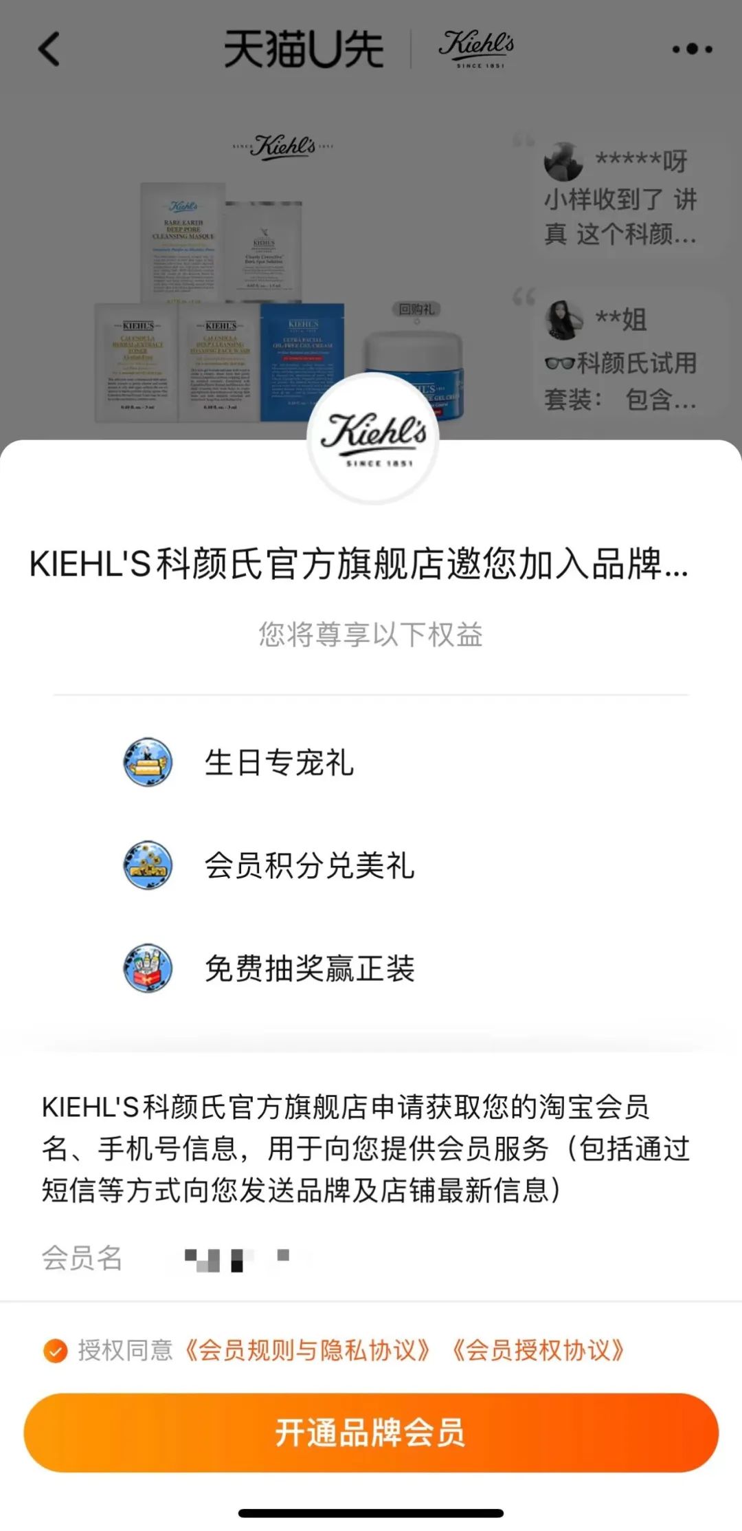 仔细来看天猫U先9.9元面膜的购买路径。消费者在进入试用装购买页面后点击下方的“立即领用”,首先跳出来的是“入会”页面,也就是成为该品牌的会员并自动关注该品牌官方店铺。