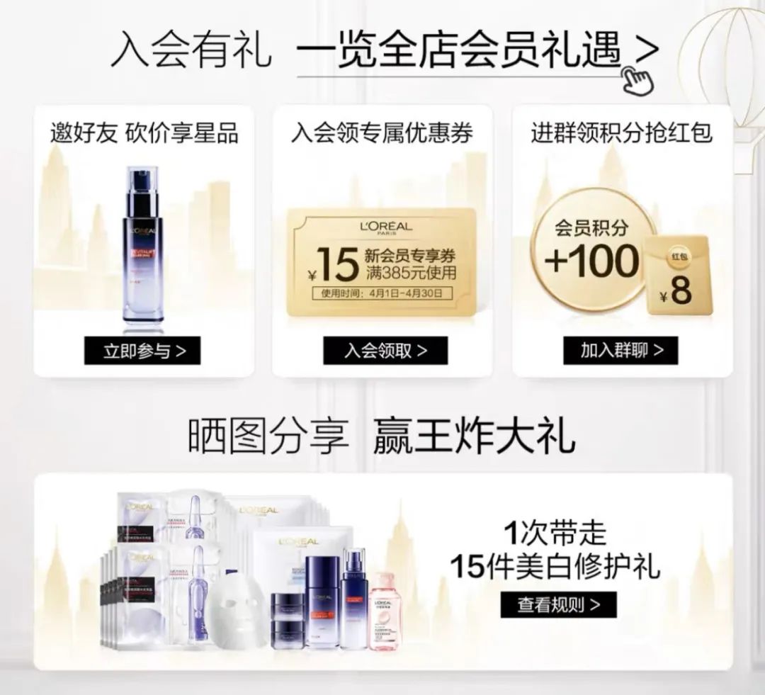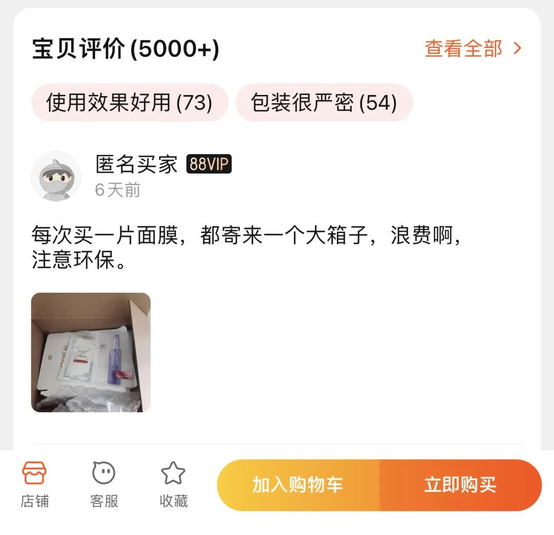 点击同意之后,会自动跳转到品牌旗舰店购买页面,同时出现的是“入会礼遇”以及“晒图分享赢王炸大礼”的宣传语。以欧莱雅面膜的页面为例,现在已经有超过5000+的宝贝评价和用后心得分享。
