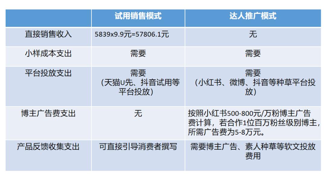 假定以欧莱雅玻色因面膜为例进行分析,目前在天猫U先上该产品成交量为5839次,可获得直接销售收入约5.8万元。虽然尚不清晰下面两种营销模式下平台投放费用之间的差距,但抛开转化率单纯比较额外支出方面,达人推广模式需要的成本比试用销售成本支出更加复杂。