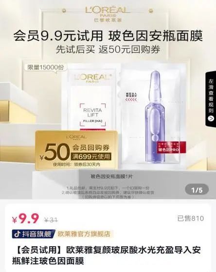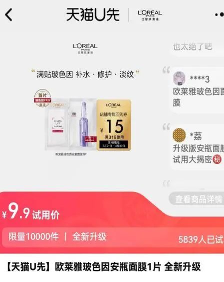 很多大品牌会同时在天猫U先和抖音试用进行同一种类的商品投放,像近期欧莱雅主推的玻色因安瓶面膜都出现在了两家平台首页。点开试用商品链接,可以观察到目前天猫U先的销售量比抖音试用要高出7倍左右。