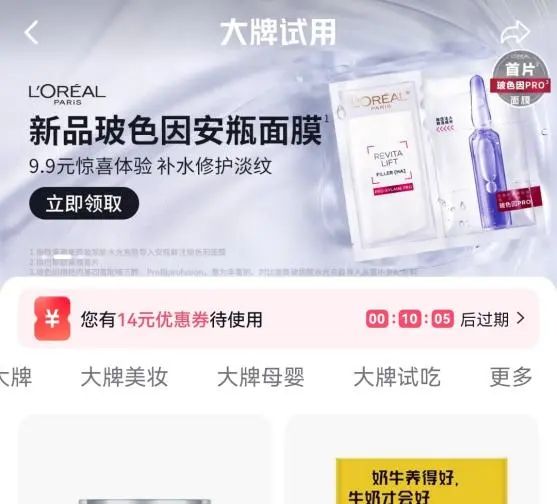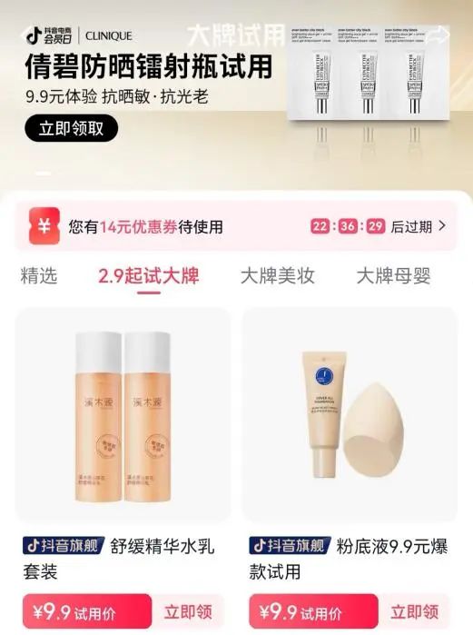 无论是U先试用首页的“9.9元科颜氏星品体验包”,还是抖音试用首页的“9.9元倩碧防晒镭射瓶体验装”,当各种各样正装原价动辄上千上百的大牌护肤品和“9.9元”的价格标在一起的时候,“不买错过一个亿”的感觉油然而生。