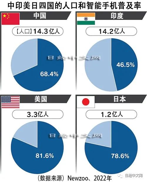 从苹果来看,iPhone占营业收入的约6成,但世界各国的智能手机市场正面临成熟。荷兰调查公司Newzoo的数据显示,2022年美国智能手机普及率达到81.6%,日本为78.6%。截至同年拥有最多用户数的中国也接近7成,但印度仅为46.5%。拥有约14亿人口的印度是与中国并驾齐驱的世界最大人口大国,市场的开拓空间巨大。