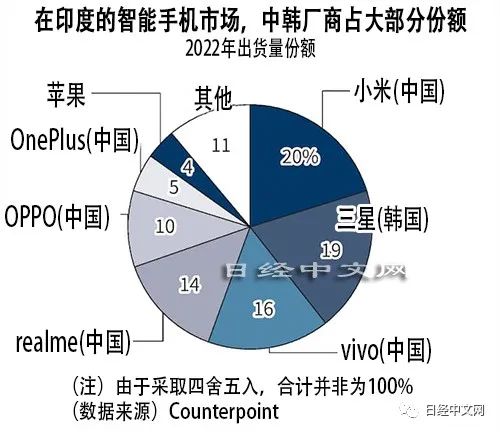 在印度的智能手机市场,价格低廉的中国和韩国的厂商占据了大部分市场。香港调查公司Counterpoint的数据显示,2022年印度智能手机出货量的首位是中国的小米,占20%,第二位是韩国三星电子,占19%。