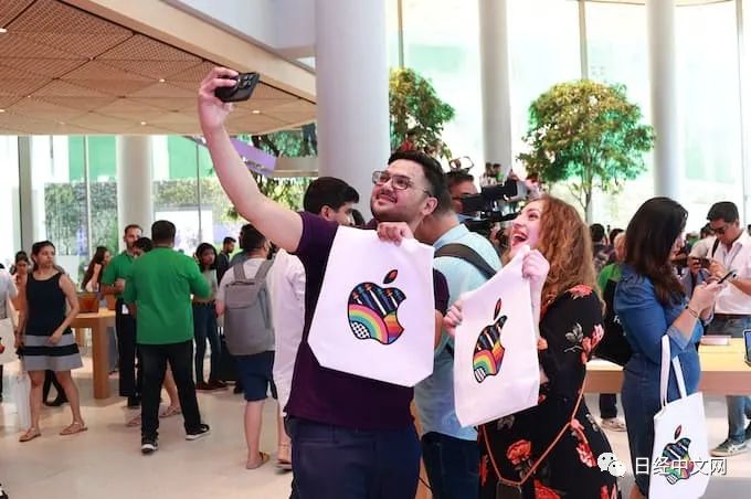4月18日,在苹果直营店入驻的印度商业中心孟买的一处商业设施。自上午11点开店前,就有数百人聚集。一位从500多公里外的艾哈迈达巴德赶来的20多岁男子表示“我非常兴奋。期待印度的苹果商店不断增加”。苹果20日还将在首都新德里开设店铺。