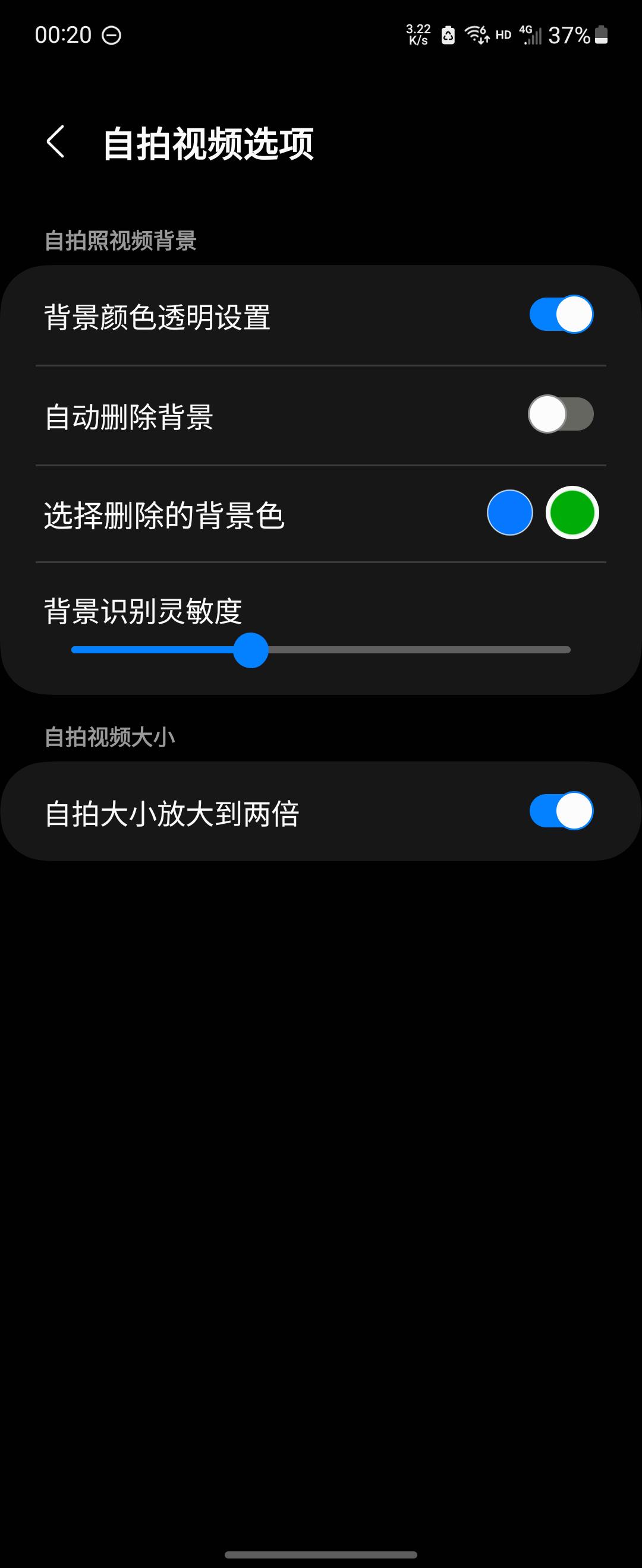 新 NiceShot 除了保留一个在截图工具栏中添加删除按钮的功能,主要增加了一项录屏增强功能。录屏时,One UI 允许同时录制自拍视频,在 NiceShot 打开背景颜色透明后,可以识别并抠色;或如果你没有绿幕,也可以打开自动识别删除背景,调整到合适的灵敏度录制。实测背景识别的效果一般,如果要使用内置录屏工具录制讲解视频,还是有一个纯色背景比较合适。