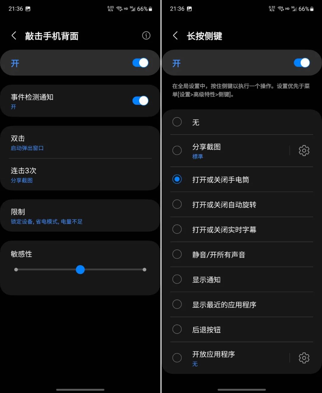 其一是轻敲背面完成截图、打开应用程序、开启浮窗模式等功能,可以设置双击与三击控制,同时提供了敲击灵敏度设置与敲击提示。实测中档与低档都不容易引发误触,且当前版本下,默认锁定设备时该功能不可用。