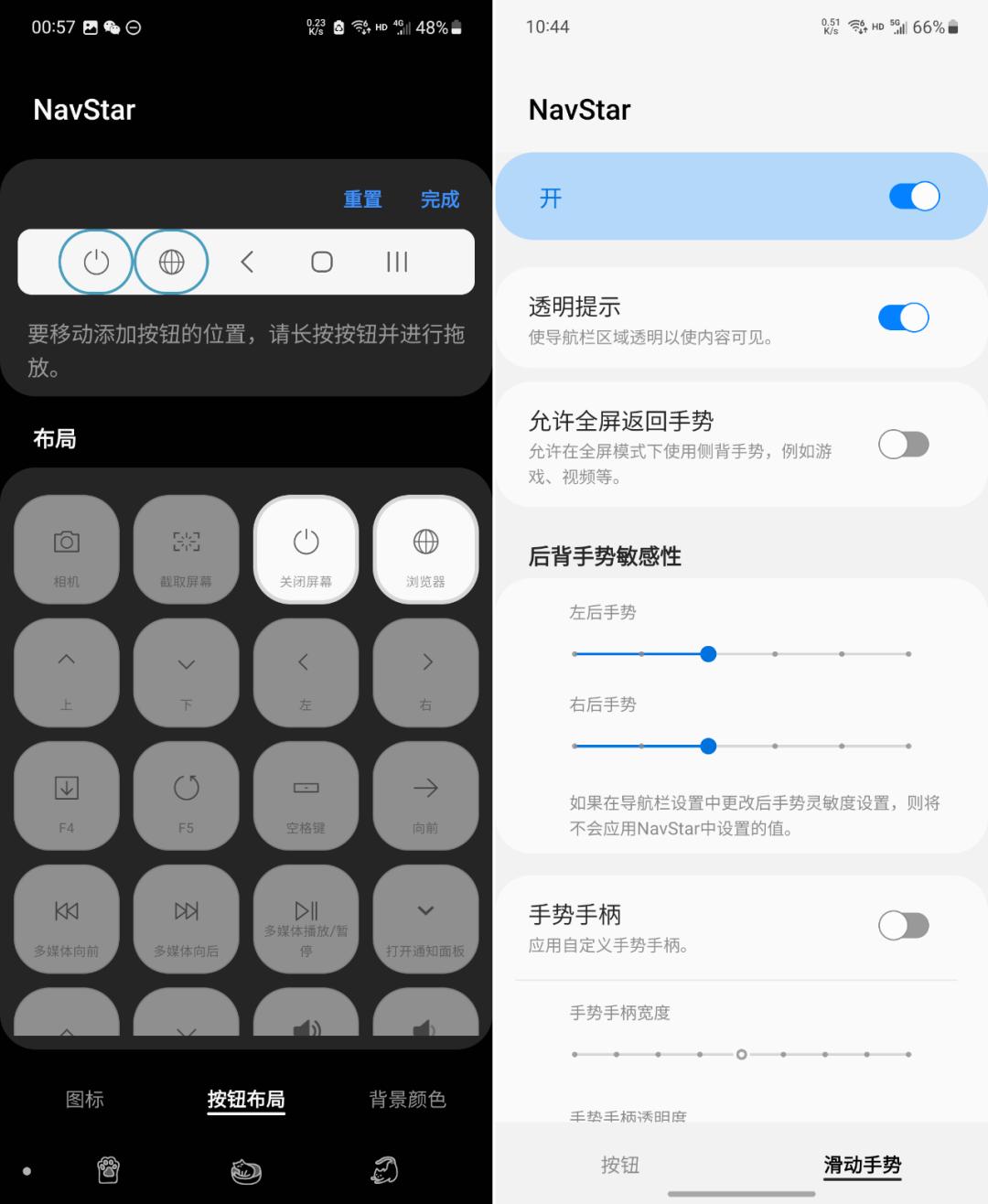 NavStar自定义导航栏的工具。(如果你还是三大金刚键的坚定守护者,)NavStar 可以替换导航栏三大金刚键的图像,还可以在导航栏增加按键。新版本 NavStar 增加了滑动手势的设置,可以设置导航栏透明、全屏下可以使用返回手势、调整返回手势灵敏度等。