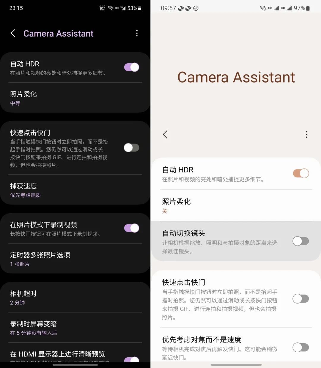 Camera Assistant 最主要的功能就是照片柔化开关,默认关闭,可以设置中等与高两档,实测效果还是很明显的,可以有效改善主摄像头锐化过度的问题。