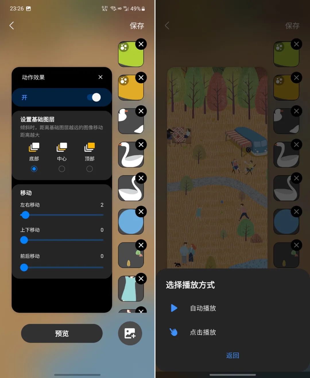 基底可以采用纯色、二色渐变或图像,之后的图层可以使用内置的贴纸素材,也可以是文本、图片、视频等。如果你想的话,仙境的自由度可以非常大,比如可以把图片设置成与点击动作配合的粒子,成为主题壁纸动效。