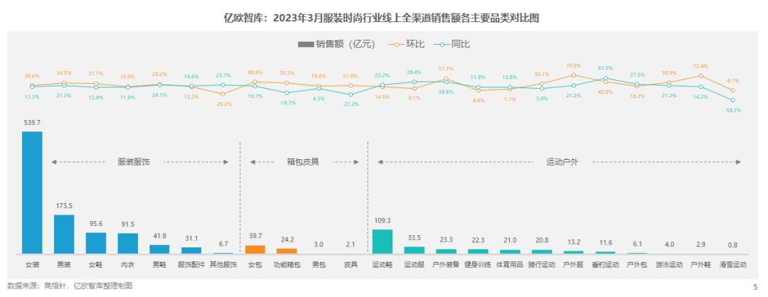 近日,亿欧智库发布《新消费行业月度观察报告-服装时尚-3月篇》。《报告》称,随着经济稳步复苏、消费需求回升,大部分行业3月线上销售额同比增长明显,其中与服装时尚相关的三个品类都实现了同比上升。