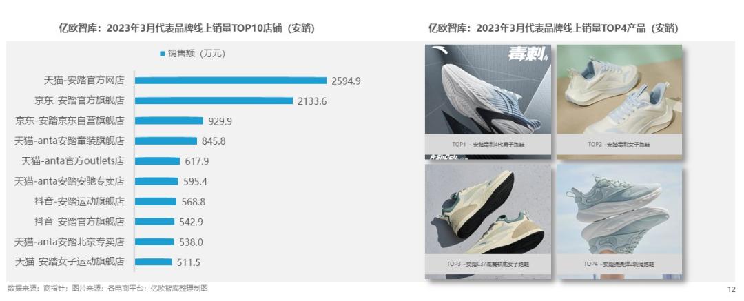 其线上销量TOP10店铺以天猫为主,并活跃于京东、抖音等各平台旗舰店、专卖店与网店。安踏线上销量TOP4产品分别为:安踏毒刺4代男子跑鞋、安踏毒刺女子跑鞋、安踏C37减震软底女子跑鞋、安踏绵绵弹2跳绳跑鞋。