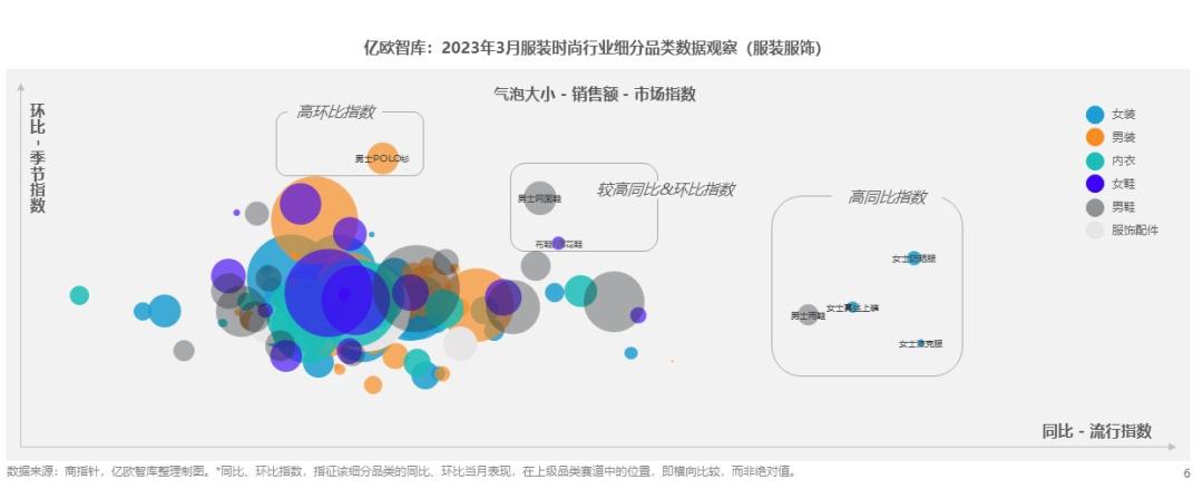 随着气温逐步回升,人们的户外活动愈加多样化,带动了不少细分品类增长。与其他细分品类相比,女士派克服、防晒服、真丝上装、男士雨鞋呈现高同比指数;男士POLO衫较上月连续呈现高环比指数;男士网面鞋、布鞋/绣花鞋既呈现较高同比、环比指数,属于3月鞋品中的畅销单品。
