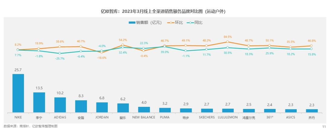 随着中国全民健身意识的提升,国货运动品牌快速把握了体育消费持续增长的态势,以强劲的发展实力向市场主导地位进军。《报告》数据显示,3月,线上渠道销售额排在第二和第四的分别是李宁和安踏,环比增长分别为19.9%和40.7%。