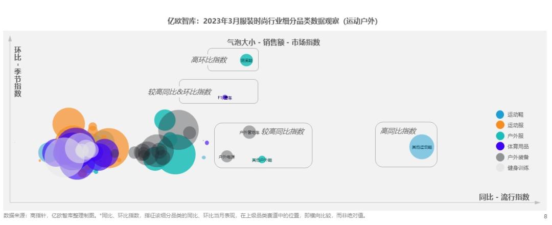 《报告》指出,3月正值春暖花开、冰河春醒的时节,“外出”成为常态,户外服深受消费者青睐,销售额环比增长76.0%,同比增长21.2%,户外鞋、户外装备3月环比分别上升72.4%,57.7%。