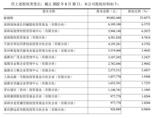 招股书显示,陈朝晖2019年12月将其持880万元出资额转让给南海成长、霍普投资、前海投资、常州彬复、祖文博。2020年5月转让430万元出资额给高瓴怿恒、茅台投资、霍普投资、常州彬复;2020年7月所持82.8889万元出资额转让给壹叁投资;2020年8月,再次转让272.7667万元出资额。经估算,不到一年时间,陈朝晖4次取得转让款近2个亿。