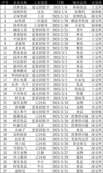 2023年一季度,根据蓝鲨研究院数据,排队上市的消费企业数量接近40家,既有澜沧古茶、德州扒鸡、紫林陈醋等享誉老字号,也有富岭股份、恒鑫生活等成立近20年的消费供应链企业,还有在2015年之后成立的KK集团、认养一头牛、青岛沃隆食品等新一拼网红品牌。需要注意的是其中不少企业都是出现大面积亏损、资金压力大的。