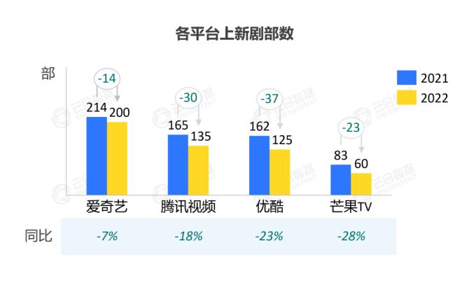 据云合数据,2022年各视频平台上新剧部数缩减7%-28%。其中爱奇艺上新国产连续剧200部,同比减少14部;腾讯视频上新国产连续剧135部,同比减少30部;优酷上新125部,同比减少37部;芒果TV上新60部,同比减少23部。