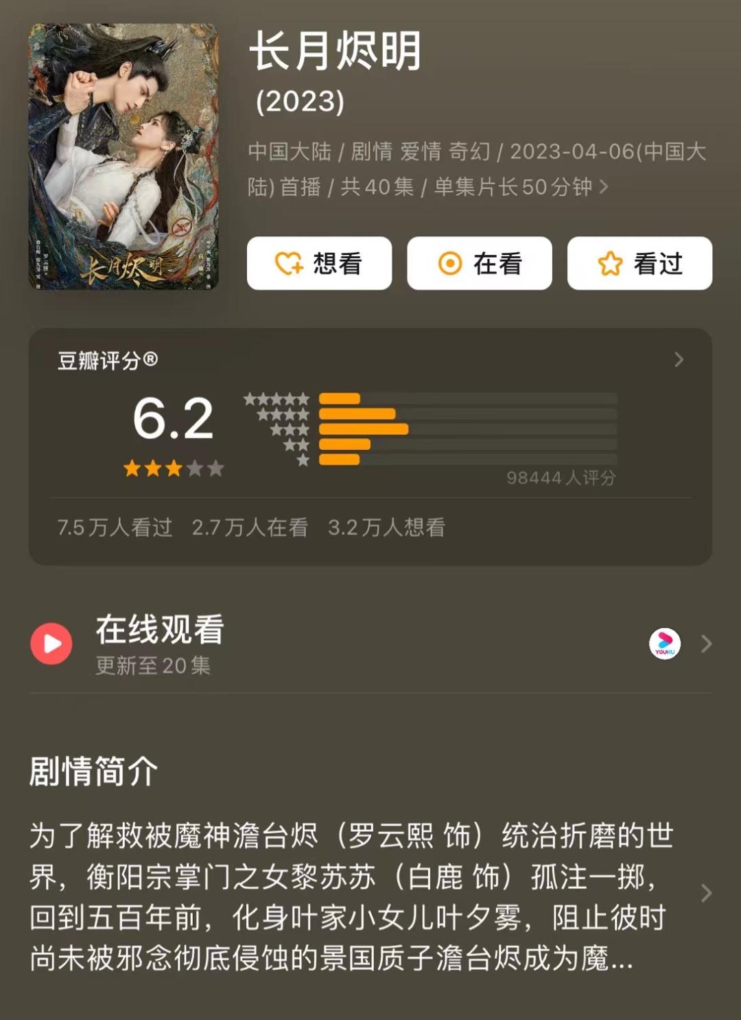新奇的设定和加上精良的制作,《长月烬明》开播29个小时便在优酷站内实现热度破万,一跃成为优酷目前热度破万最快的剧集,甚至带动优酷成为苹果商店免费APP下载量top1。