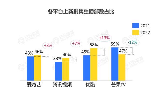 2022年,各平台上新剧集独播占比均超40%。其中爱腾优上新剧集独播部数占比分别为46%、40%、58%,同比上涨3-13个百分点;芒果TV独播占比为47%,同比下降12个百分点。