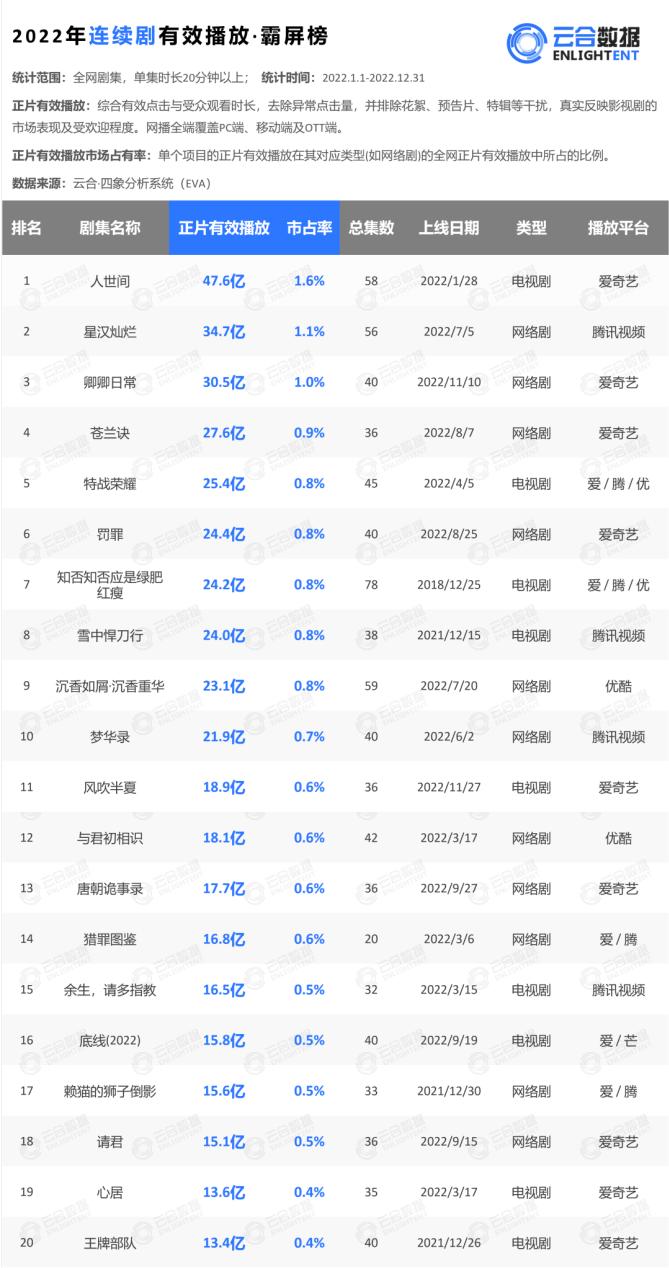 云合数据显示,2022有效剧播放霸屏榜上,《人世间》正片有效播放47.6亿,排名第一,《星汉灿烂》的有效播放为34.7亿,排名第二,《卿卿日常》《苍兰诀》紧随其后。