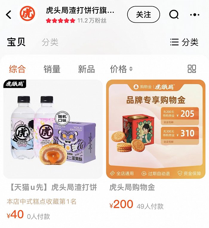 目前虎头局的天猫旗舰店只有一款“蛋黄酥/凤梨酥”上架,但付款人数为0。界面新闻记者在对店铺是否正常运营求证客服时,对方表示“仍在正常营业,因为运营重装以及整理仓库所以下架产品,后续会陆续上架。”