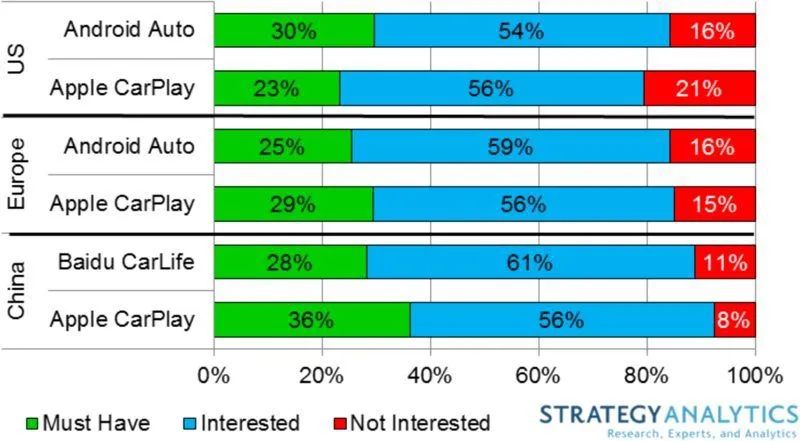 到了今天,CarPlay 已经成了大家买车时的重要需求之一,根据 Strategy Analytics 在前几年的报告显示,23% 的美国新车购买者表示他们“ 必须 ”拥有 CarPlay,而国内更是有超过三分之一的人钟爱 CarPlay。