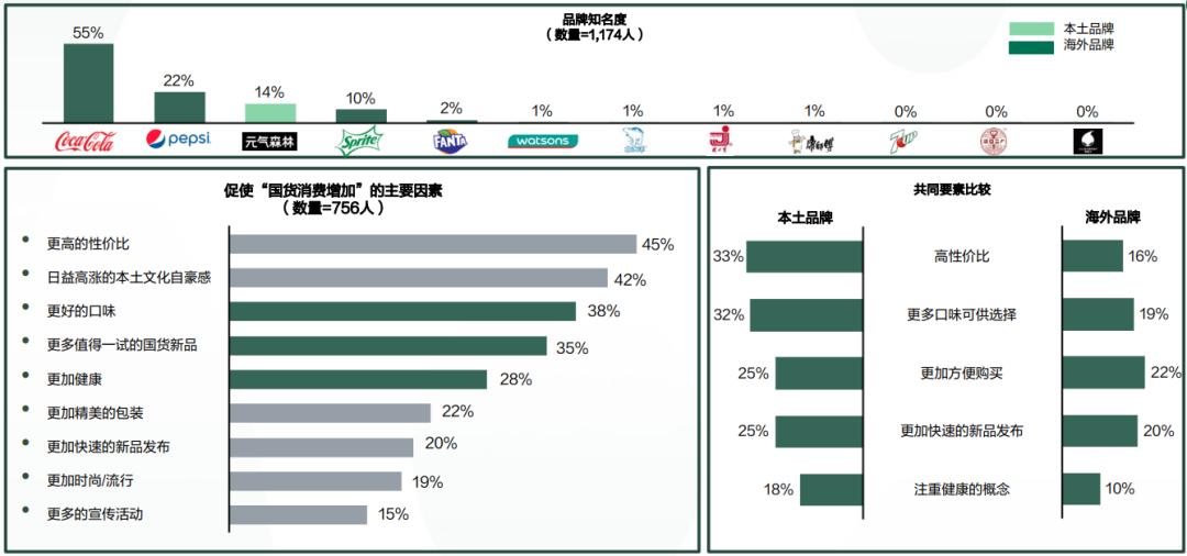 从独立品牌的知名度来看,可口可乐和百事依旧是知名度最高的品牌,消费者喜欢海外品牌的经典口味。但随着本土品牌不断推出新口味并扩展新渠道,消费者也变得更乐于尝试购买国产饮料。
