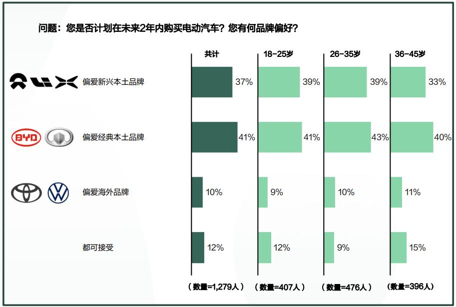 对电动汽车的偏好上,红杉中国的调研显示,37%的中国消费者偏爱新兴本土品牌,41%的消费者偏爱经典本土品牌,仅有10%的消费者更偏爱海外品牌。