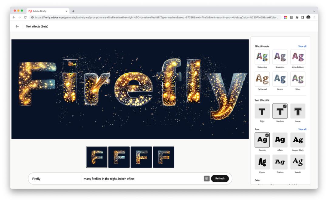 Firefly主要提供两种功能。其一是利用文字生成图像的功能,另一种是进行字体效果编辑。类似于目前流行的AI绘图工具,Firefly可以根据提示词“prompt”生成图像,并提供数百种风格供用户调整。