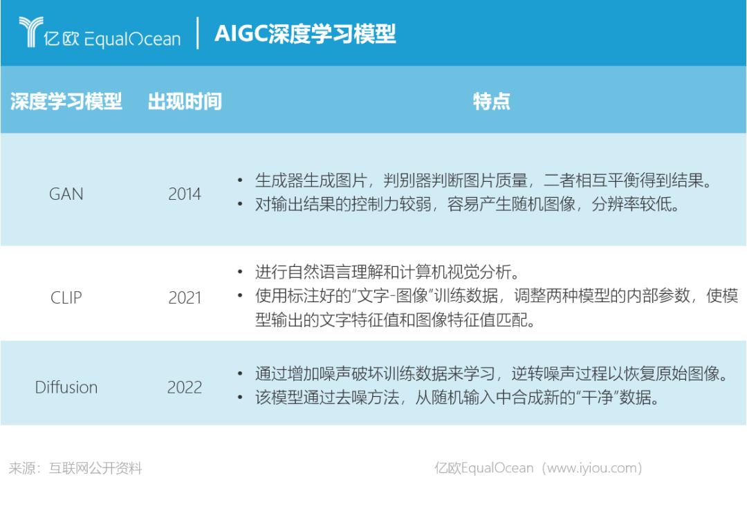 AIGC在2022年实现破圈,帮助大众画出各种天马行空的画作,背后离不开大量深度学习模型的不断完善。这其中,CLIP模型基于海量互联网图片进行训练,促进了AI绘画模型的组合创新。另外,Diffusion扩散化模型的引入也实现了算法创新,最终使用潜空间降维的方法解决了Diffusion模型在内存和时间消耗上的问题。