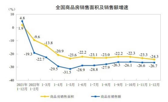 以楼市为例,受调控加码及消费者买涨不买跌的心理影响, 2022年全国商品房的销售面积及销售额增速,双双跌入负增长区间 。