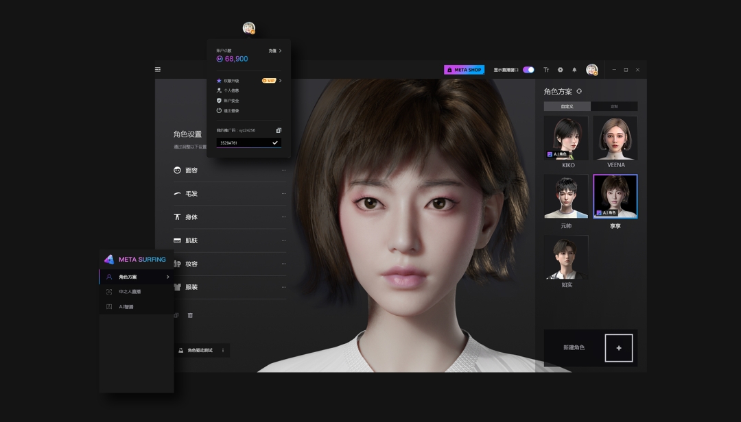 - 数字人生成:元享为用户提供捏脸系统,可以帮助用户快速生成自己想要的角色。该系统拥有“细致捏脸”、“融合模式”、“雕刻模式”等三种,支持全身300余种参数的设置,可对形体、纹理、材质、颜色等不同维度进行调整,让数字人物更加真实、生动、自然。同时,按区域进行捏脸的雕刻模式以及可将不同的3D模型进行不同权重进行融合的融合模式,将帮助用户快速产出数字人,从而得到更加贴近个人需求的创作结果。