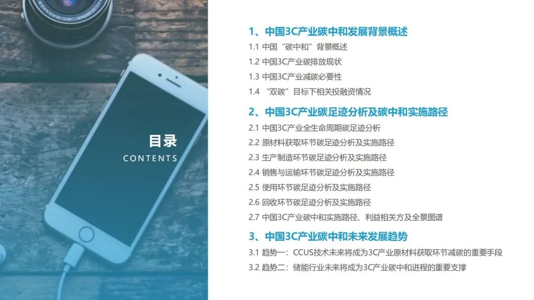 本报告基于碳中和目标,梳理当前3C产业碳中和发展背景与3C产品全生命周期碳足迹现状,并结合各环节企业碳减排优秀案例,提出中国3C产业碳中和实施路径,希望能够为3C产业迈向零碳可持续发展提供借鉴。