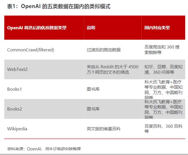 (OpenAI五类数据在国内的类似模式 图源:民生证券)