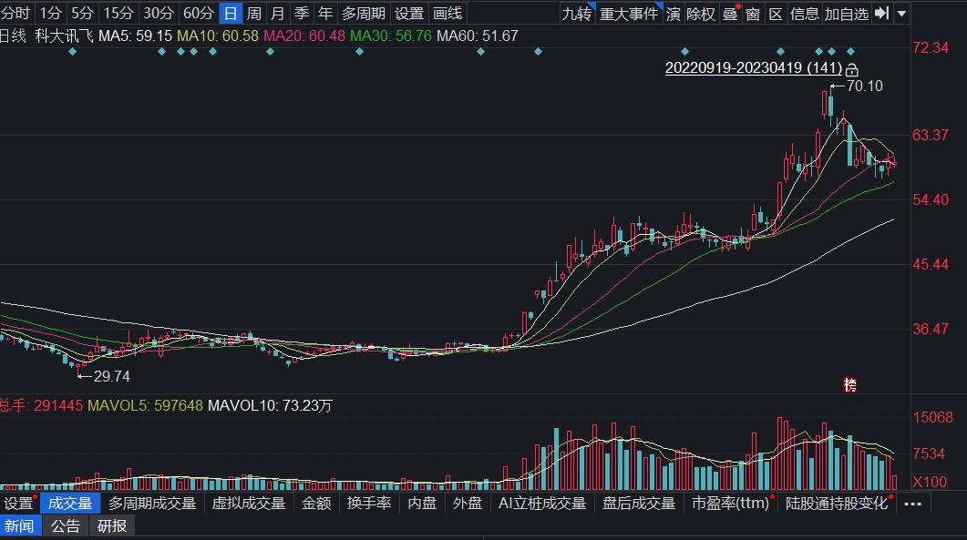 现如今,ChatGPT又把AI产业带得热火朝天,行业催化效果充足:自2023年以来,科大讯飞在4月初股价到达今年顶峰,从34.7直接翻了一倍至69.3。