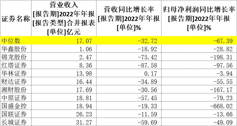 营收规模排名靠后的小券商的经营状况就更加艰难,营收和归母净利润同比增长率中位数分别为-32.72%和-67.39%,均大幅落后于头部券商。