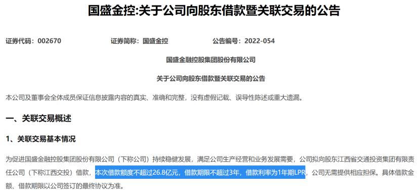 2022年9月,国盛金控公告称,拟向股东江西交投借款26.8亿元,借款期限不超过3年,借款利率仅为1年期LPR。