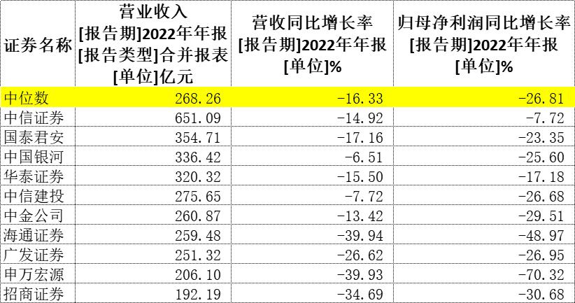 即便是大券商,在2022年的行情中也未能有所斩获,截至4月21日,共有31家上市券商发布去年财报。其中,营收规模排名前十的头部券商,营收和归母净利润同比增长率中位数分别为-16.33%和-26.81%;