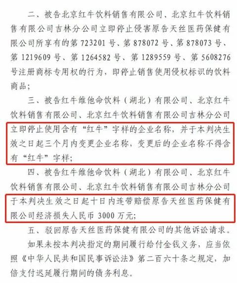 要求三家企业立即停止生产、销售“红牛维生素功能饮料”,立即停止使用含有“红牛”字样的企业名称,同时连带赔偿原告泰国天丝 3000 万元。