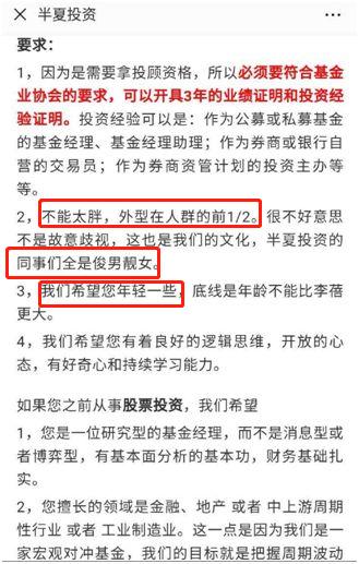2018年,“私募魔女”李蓓的半夏投资招聘基金经理,要求总结一下就是:不能太胖!不能太丑!不能太老!当然,还不能太差!