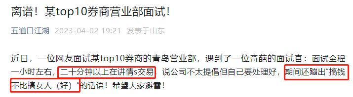 今年,某网友面试某top10券商的青岛营业部,就遇到了一位奇葩的面试官:面试全程一小时左右,二十分钟以上在讲情色交易……